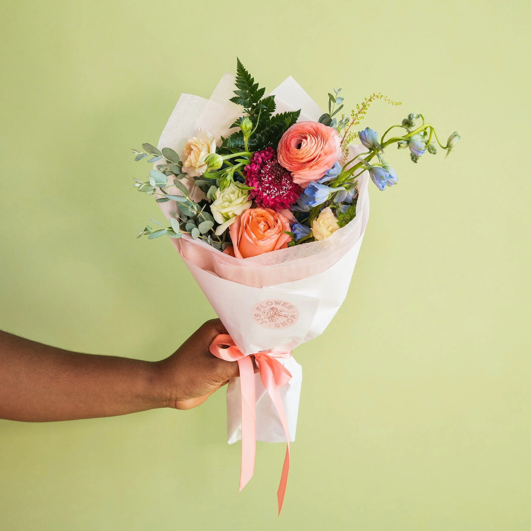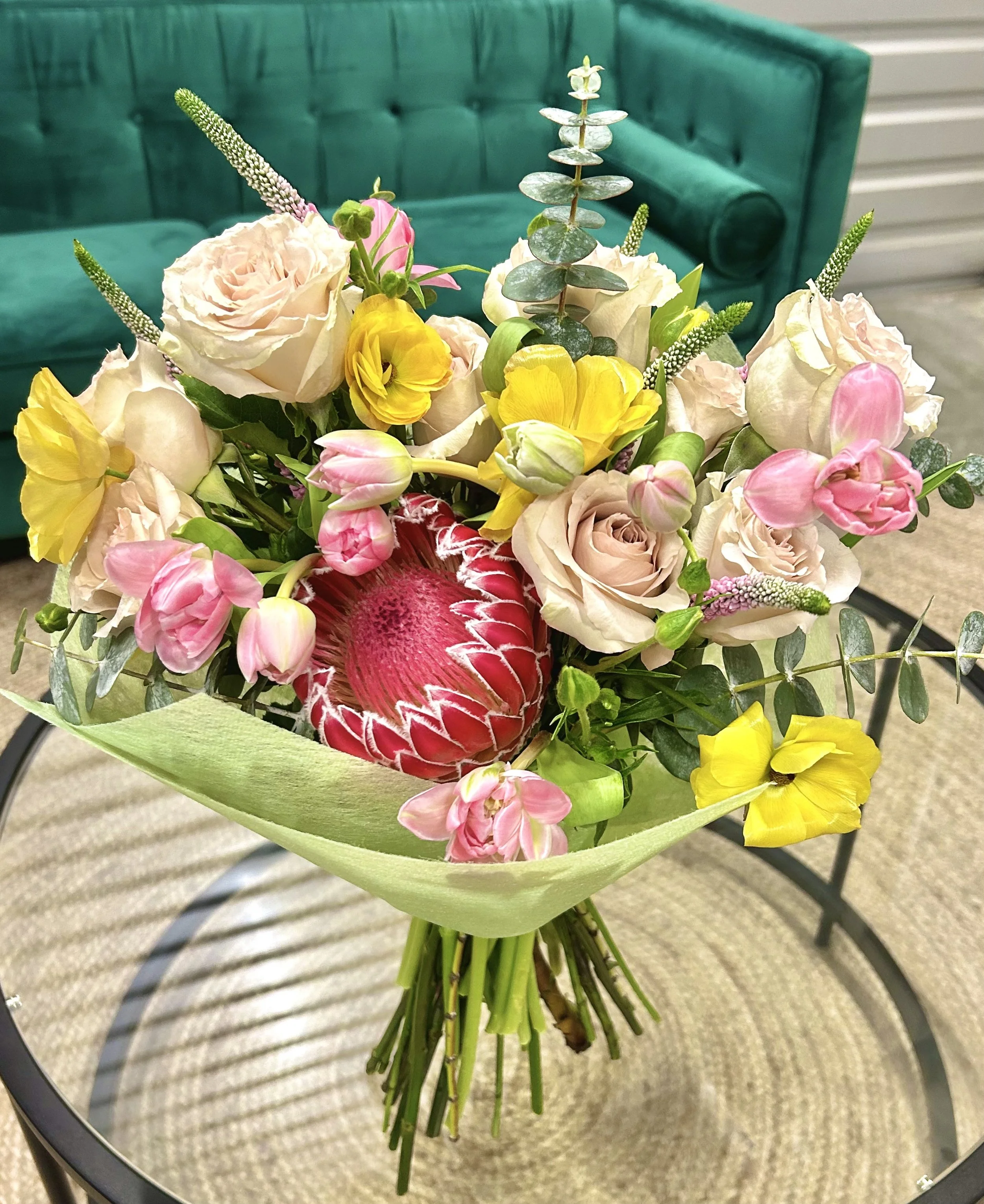 Hand-crafted seasonal bouquet with fresh florals. Bouquet comes in our small size.